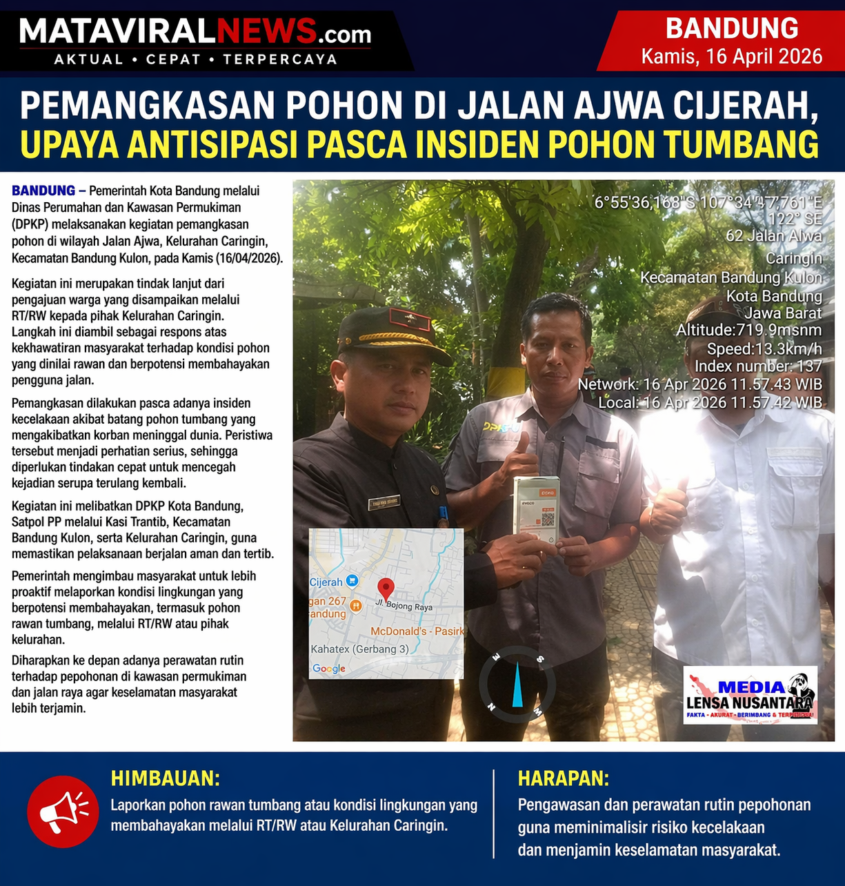 Bandung —mataviralNews.web.id/-Pemerintah Kota Bandung melalui Dinas Perumahan dan Kawasan Permukiman (DPKP) melaksanakan kegiatan pemangkasan pohon di wilayah Jalan Ajwa, Kelurahan Caringin, Kecamatan Bandung Kulon, pada Kamis (16/04/2026).